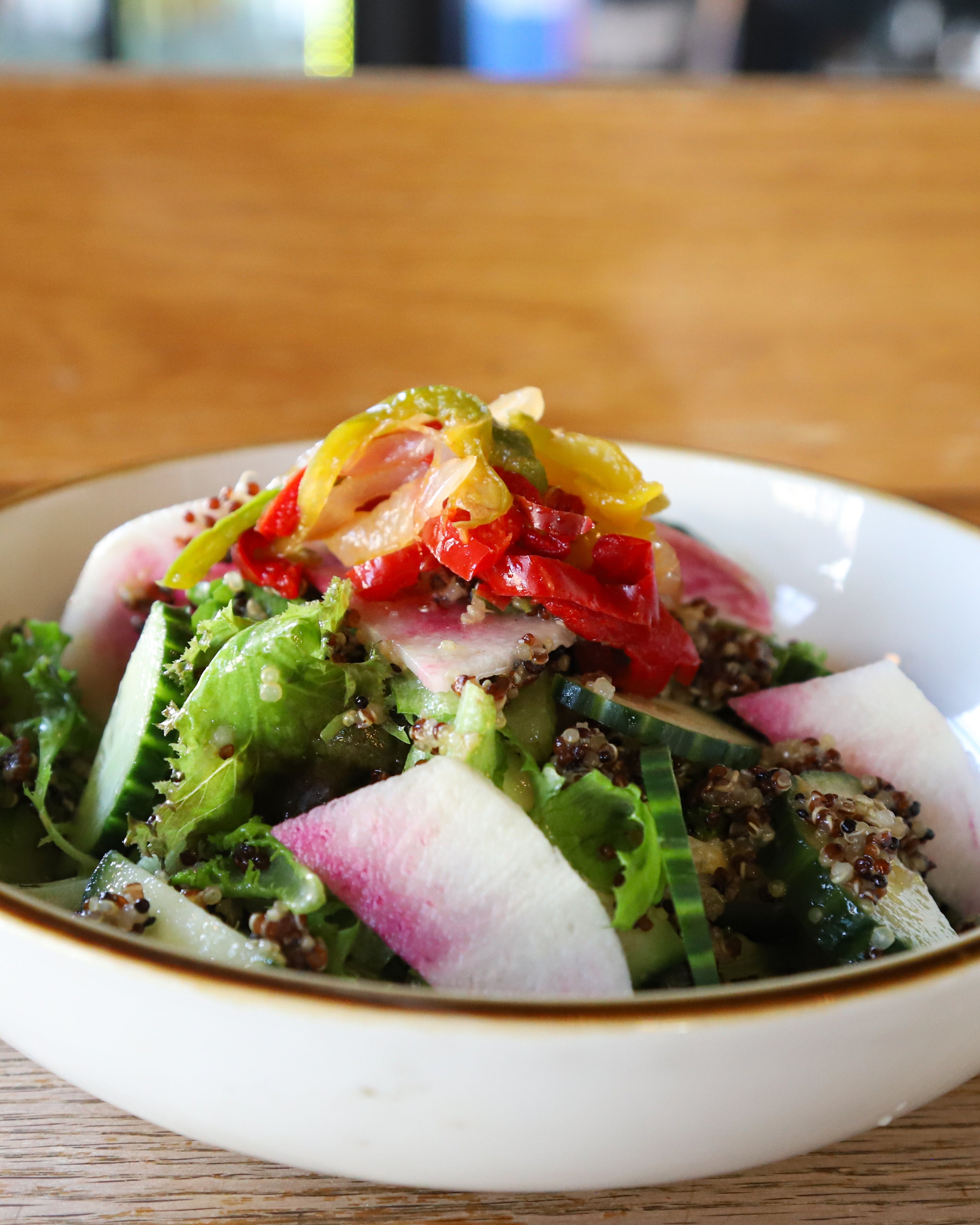 Bright, fresh, and tangy, the Rainbow Quinoa Bowl is packed with crisp lettuce, bell peppers, watermelon radishes, cucumbers, and hearty quinoa topped with a yuzu lemon vinaigrette.